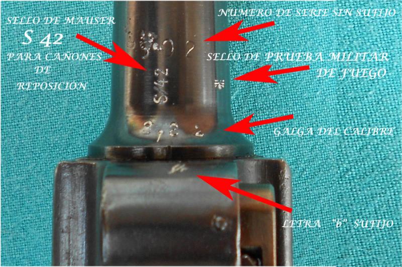Esta pistola tiene, en la parte inferior del cañón, una marca S/42. Esta significa que el cañón es una reposición de Mauser.