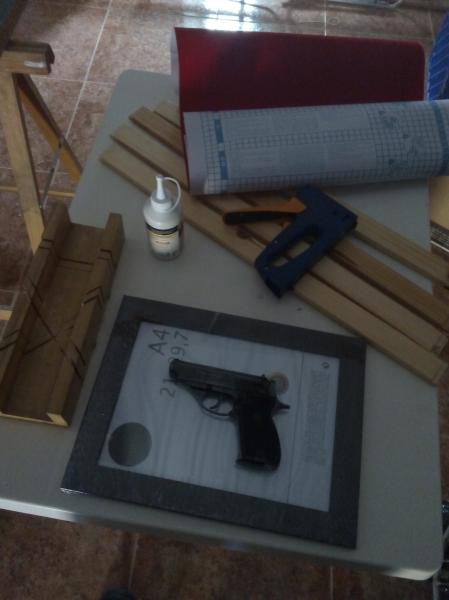 Bueno pues como ya suponéis es muy fácil de hacer, aquí lo necesario, marco de fotos tamaño a4, ingletadora,grapadora,cola madera, terciopelo adhesivo y listones del ancho que necesitemos para que el arma entre sin dar en el cristal