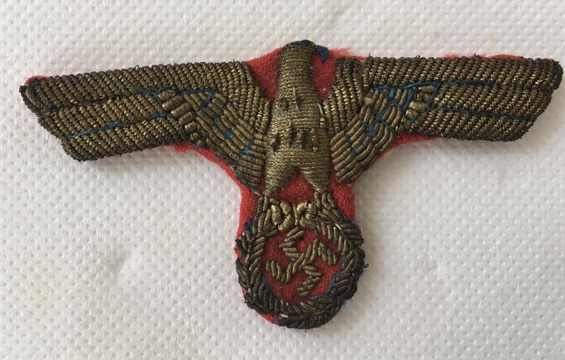 Siendo en dorado, y con la inclinación hacia abajo de las alas del águila, debió ser de la gorra de un general de la Wehrmatch. El fondo de soporte en rojo, también coincide.