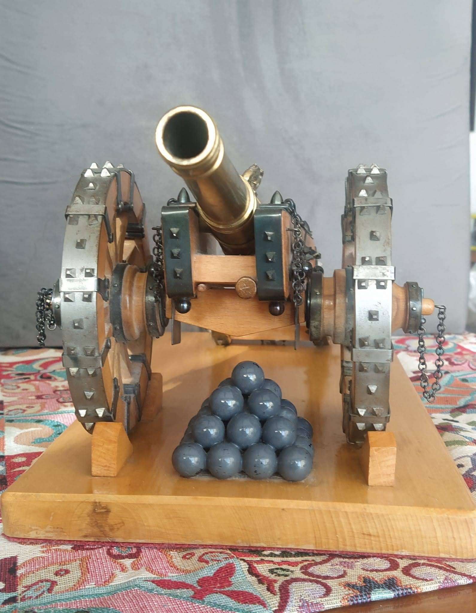 Excelente réplica histórica y decorativa de cañón antiguo (no operativo) en latón, haya y metal, construido artesanalmente, pieza a pieza -cadenas, argolla a argolla; clavos ruedas, uno a uno; etc- (sólo hay dos hechos por el mismo artesano hace 40 años) siguiendo los planos (escala 1:14 aprox.) de un cañón similar expuesto en el Museo Alcázar de Segovia. Desmontable el cañón de su cureña así como las ruedas, similar a uno de verdad. Miles de piezas y cientos de horas de trabajo. Separable de su base decorativa. Ruedas con arcos segmentados, como uno verdadero ( garantizan soportar el peso de una persona de 100 kgs subido en ellas) y cañón pivotante. Preferiblemente se entrega en mano en Madrid capital.