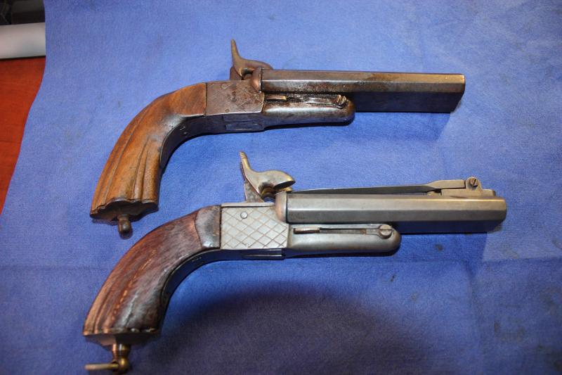 Buenas tardes a todos, bueno ha llegado a mis manos una pistola lefaucheux. He medido el interior de los cañones y me da unos 12mm, he estado buscando unos marcajes a la pistola y de momento solo he encontrado de bajo del cañon una inicial grabada, lo que parece ser una "S", ¿esto es posible?¿significa algo? si no significa nada creo que pudiera ser la inicial del apellido de donde procede el arma.El arma mecaniza perfectamente( no quiere decir que vaya a disparala).Tiene grabados los gatillos y parece ser que tiene los cañones marcados con con un 1 y 2. ¿ Alguien me puede decir algo mas de esta pistola ? Tengo otra pistola lefaucheux en casa y la verdad que hay algunas diferencias.