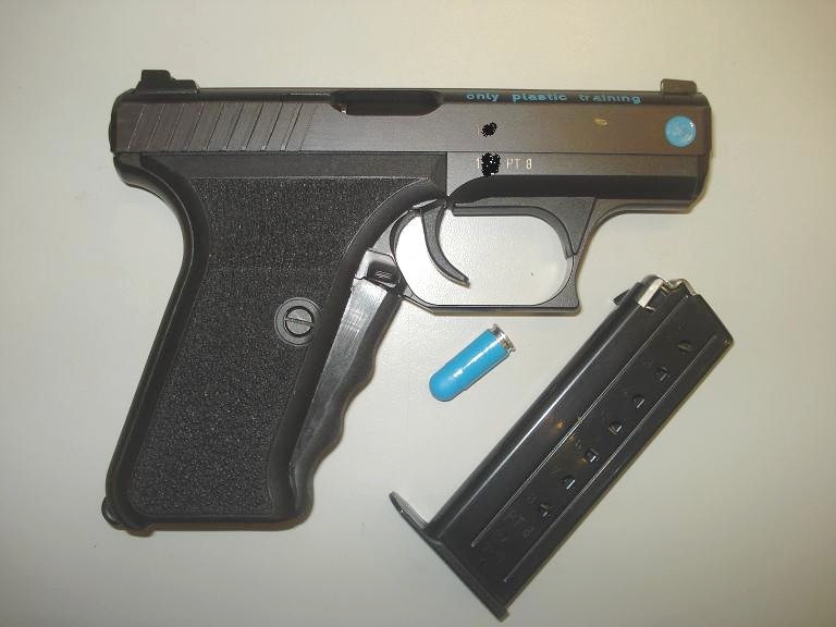 Por lo poco que he visto, la P7PT8 es una de las muchas variantes que existen de la P7 y una de las más raras. Según parece se hicieron únicamente 187 unidades entre los años 1.982 y 1.983. Es una P7 de entrenamiento a la que han modificado sus mecanismos (está al parecer dotada de una especie de recámara flotante o algo parecido cuyo funcionamiento no alcanzo a entender; estaría bien poder ver unas imágenes del despiece de la tuya) para poder ser utilizada con unos cartuchos de calibre 9 mm parabellum especiales que fabrica en plástico la firma Geco (PT significa "plastik training"). La modificación según parece está hecha para que aparte de poder disparar estos cartuchos el arma sea además capaz de mecanizar e introducir un nuevo cartucho en la recámara tras cada disparo, ya que he visto un video en el que un individuo tirando estos cartuchos de plástico con otro modelo de pistola tiene que ir montándola a cada tiro que realiza para poder seguir disparando, ya que la corredera no tiene la suficiente fuerza para poder llegar a su posición más retrasada.