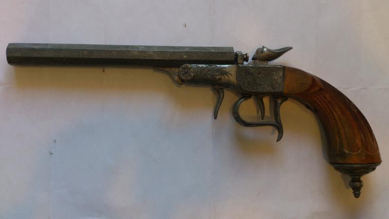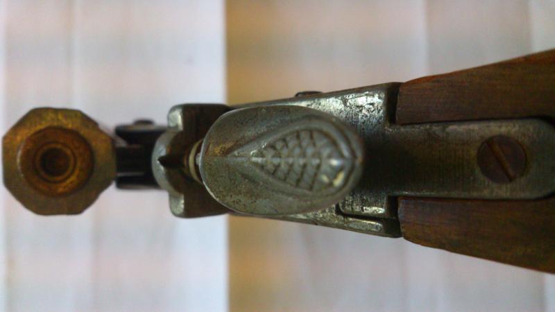 En la primera foto se aprecia que el martillo golpearia en un percutor, aguja percutora, que tiene un muelle. En la segunda foto se aprecia que la cola del martillo se fabrico de fundicion en molde, en el centro se aprecia donde estaria la union del molde. La patina del metal no se corresponde con un arma del siglo XIX. Por todo lo anterior, yo creo que es una copia moderna de una pistola de salon.