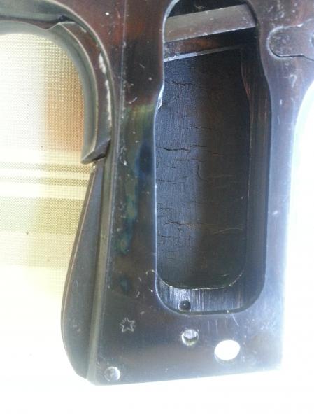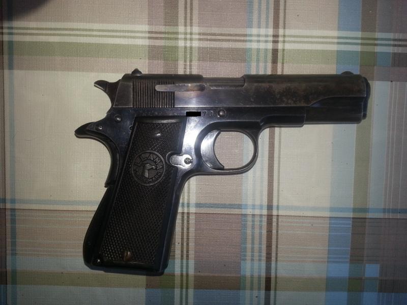 He mirado las fotos de la que has puesto y la hallada no tiene la marca de la P dentro de la bomba que esta en la parte posterior de la corredera encima del seguro ni las marcas que estan en el armazon delante de la palanca de retenida.