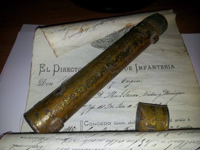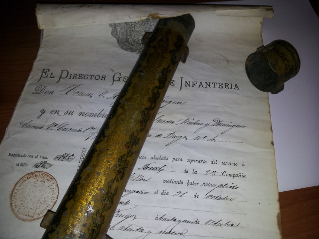 Solamente añadir que la costumbre viene de antiguo; pues ya se usaba en los tercios de flandes. Los que volvian, solian traer en un "cañuto de hojalata" sus hojas de servicio (tambien conocidos por "los papeles de las hazañas"). Alli figuraba, con quien habian servido y durante cuanto tiempo, si disfrutaban de alguna "ventaja" (ducados de mas que se añadian a la soldada y solian ser concedidos por haberse aventajado en alguna accion). Etc, . .