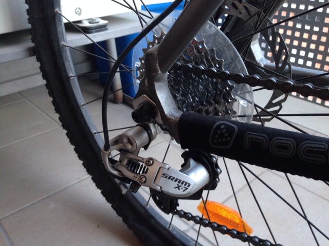 cambio y desviador sram x7, manetas sram x7, horquilla rock shox tora 302 bloqueo en manillar, bielas truvativ. Talla M. Frenos hidráulicos.