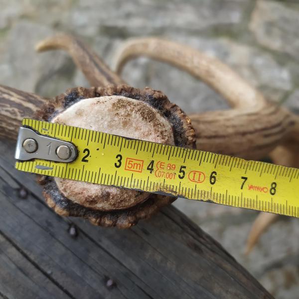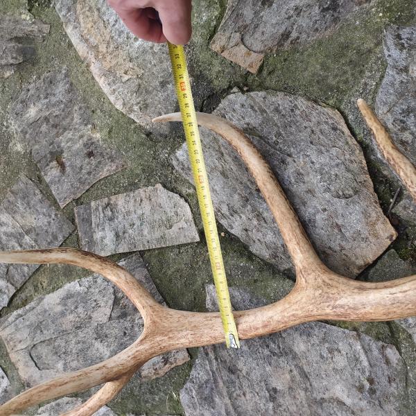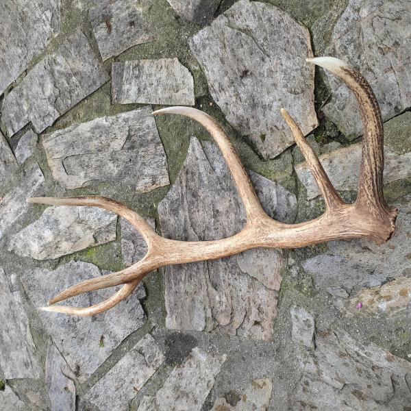 Cuerno de ciervo procedente del desmogue de este año, seis puntas (un porte magnifico) mide 70 cm de largo por 35 cm de ancho, y tiene una roseta de 5,5 cm.