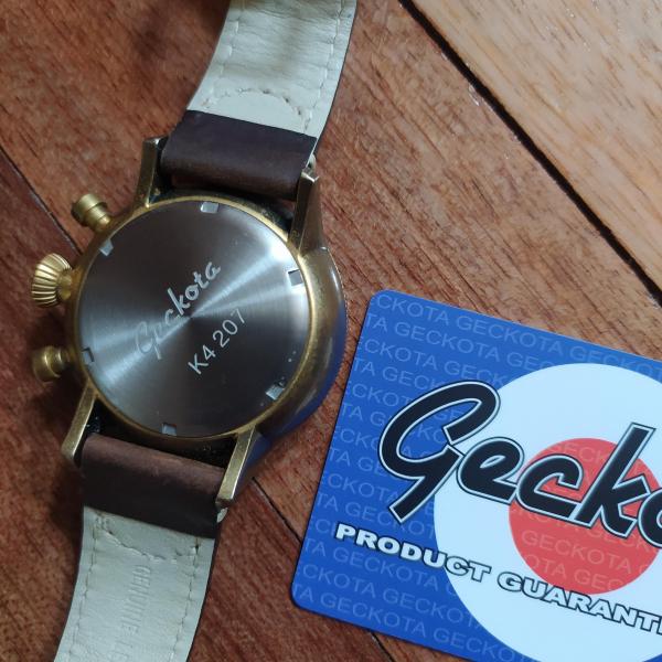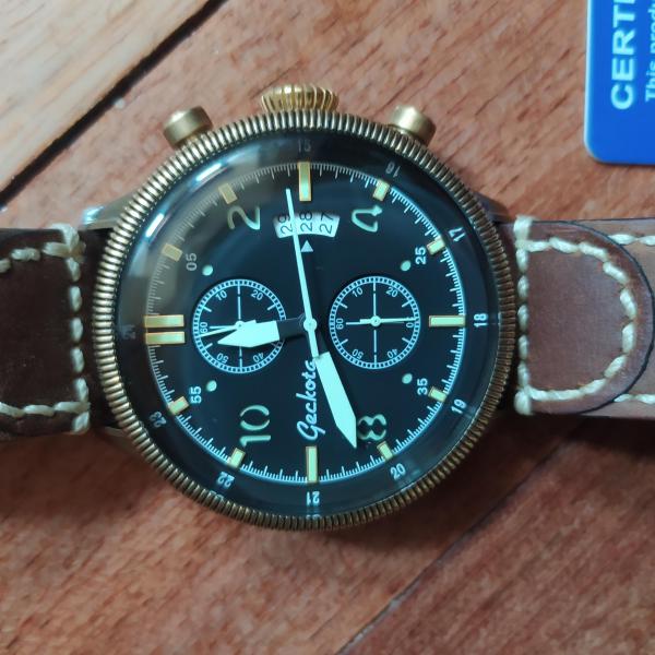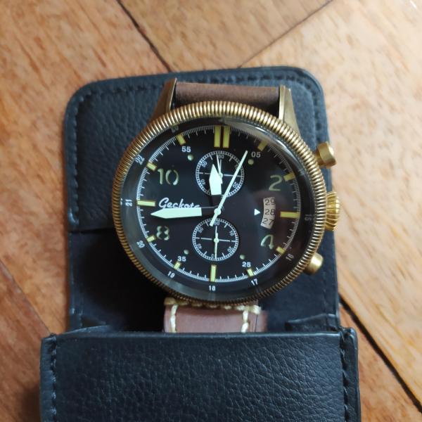 Reloj tipo pilot de la marca británica Geckota, modelo ya descatalogado, las nuevas colecciones rondan las 400/500 libras (sin contar el rejón de aduanas) mecanismo de cuarzo Seiko VD51, la caja mide 46 mm y acabada en bronce, cristal mineral templado y abombado, esfera Super-LumiNova, lumen en agujas y números, resistente al agua hasta 50 m/5 atm, precisión ±20 segundos/mes, correa de piel gruesa de muy buena calidad (esta casa fabrica unas correas excelentes, que vende independientemente de los relojes), va con un estuche en piel y tarjeta de garantía (expirada). Envío por correo certificado con numero de seguimiento incluido en el precio , la correa tiene una micro marca de unos dos mm ,ver foto, posiblemente de rozar con una pulsera. El ultimo cambio de batería fue en mayo, y me costo 4 euros. El único motivo de venta es porque estoy cambiando parte de mi colección a maquinas automáticas.