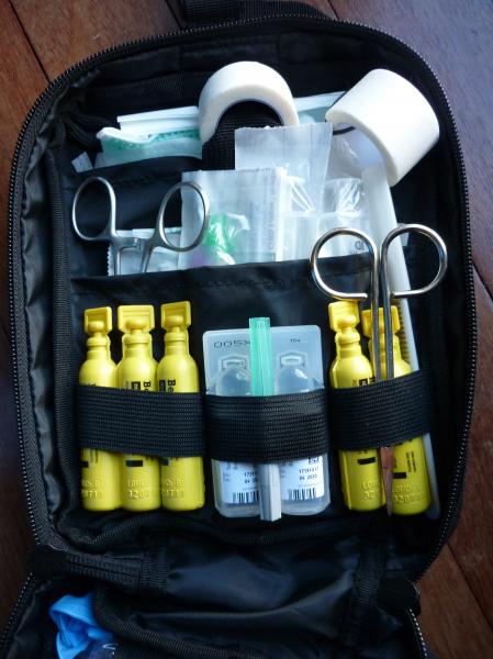 Lleva gasas y vendas de distintos tamaños, apositos esteriles grandes y medianos, 2 rollos de esparadrapo, guantes de nitrilo, pinzas, suero, povidona yodada (Betadine, 5 unds), bisturi y tijeras finas y de pinzar (de acero quirurgico), anticoagulante Clexane 60mg -Enoxaparina- 2 jeringuillas precargadas, y analgesia (1 ampolla de Nolotil 0,4 gr inyectable).