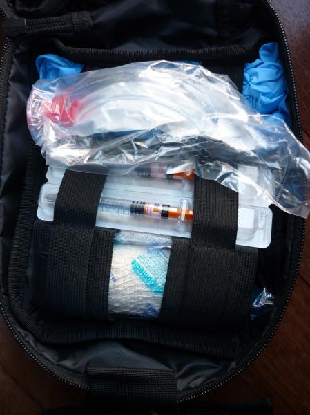 En bolsillo de malla : sutura esteril monofilamento Surgipro 3-0 para coser heridas, 2 jeringuillas de 5 ml, agujas de varios tamaños, alguna via intravenosa y manta termica aluminizada.