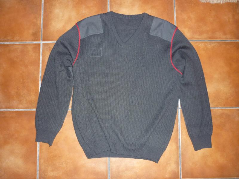 -Jersey tipo comando con hombreras y coderas, gris oscuro con dos rayas rojas y talla L, usado, sin rotos ni descosidos.