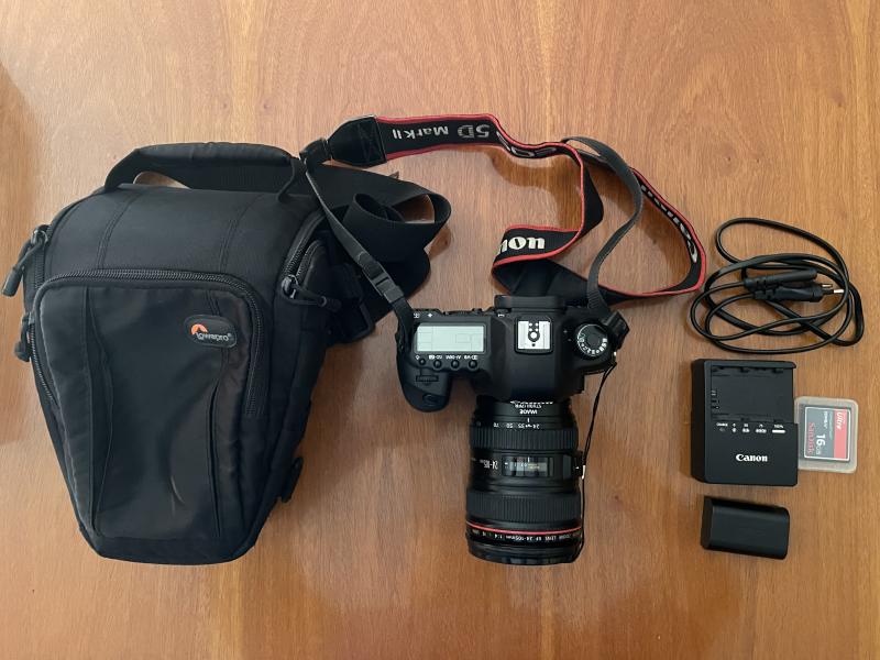Vendo cámara Canon EOS 5D MarkII con objetivo Canon 24-105mm1:4 EF L IS II USM, tanto la cámara como el objetivo están en buen estado y funcionan perfectamente, la batería esta en buenas condiciones y el cargador también, se entrega con una funda de cámara, tapa delantera de la cámara y tapas delantera y trasera del objetivo. El precio 900con el envío incluido, rebajada a 800€, mas rebajada a 750€, y regalo trípode, si alguien está interesado en mas información o en comprar uno de los dos elementos(cámara u objetivo) que lo pida por privado.