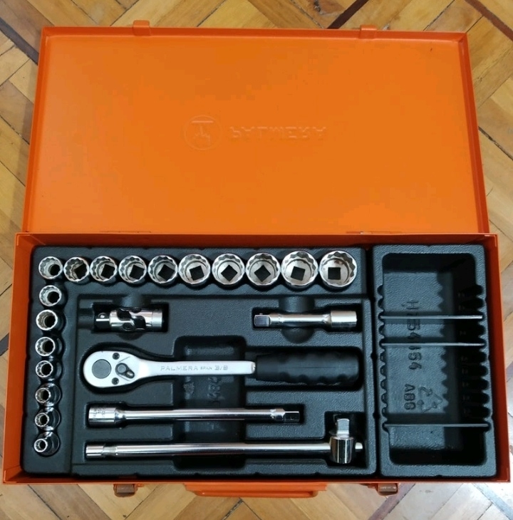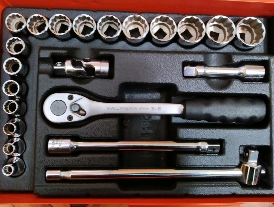 juego carraca Palmera 3/8". Vasos de 6 a 22mm. Medida de la carraca 20cm. Calidad profesional, caja metálica. Muy poco usada. Una carraca para toda la vida.
