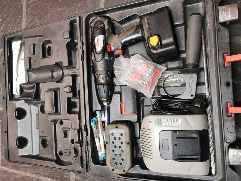 Buenos días, vendo el taladro de batería marca wurth, el taladro funciona perfectamente y tiene buen impacto usando el modo percutor, tiene también embrague para seleccionar más o menos par de apriete si se utiliza como destornillador, va con maletin, cargador y 2 baterías una batería en perfecto estado y la otra no la utilizo porque no dura prácticamente nada la carga.
