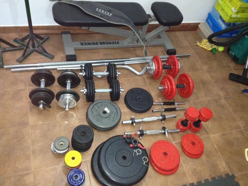 vendo lote completo de gimnasio que consta de 26 discos de medio kilo,26 de un kilos,20 de 2 kilos,2 de tres kilos,8 de cinco kilos,2 de diez kilos,2 de 20 kilos,barra de 1,75,1 barra de 1,53,barra en W,5 juegos de mancuernas,2 bancos inclinados (uno de ellos en la caja sin estrenar) y dos tripodes para press de banca y cinturon.