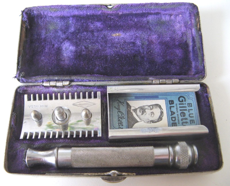 Ademas la maquinilla de afeitar, conserva su cajita metalica bañada en plata y su dispensador de cuchilla, todavía con una cuchilla de época.