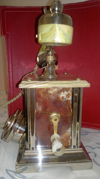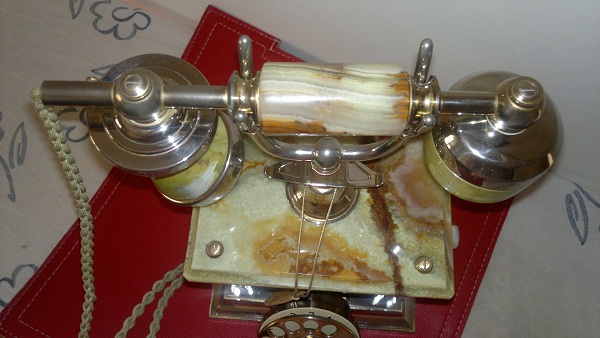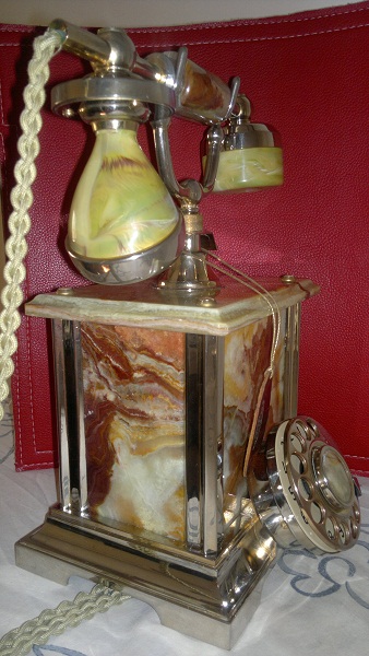Reproducción italiana (que no china) de teléfono antiguo realizada en los años '80. Realizado en mármol y metal envejecido con baño en oro de 18 kilates, imitando utilización. Auténtica artesanía italiana en perfecto estado de funcionamiento.