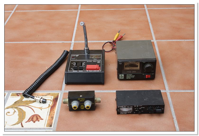 Es un micrófono Sadelta Echo Master Plus. Un medidor de estacionarias, acoplador y vatímetro EuroCB TM-100. Un acoplador Zetagi MM27. Un preamplificador HQ35 (es el que peor esta con la pantalla rota y la caja oxidada en un borde).