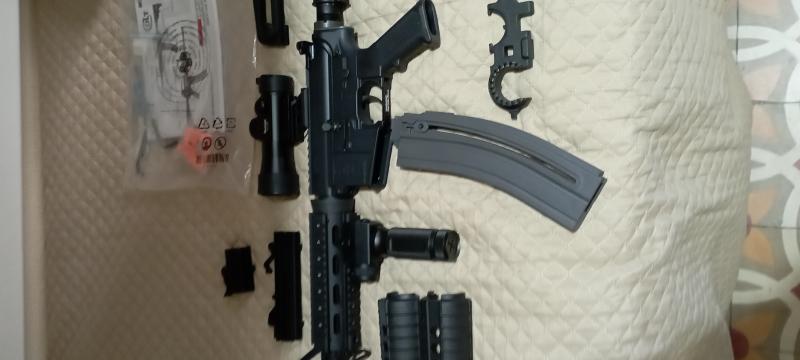 Por tema de salud y aburrimiento me deshago de una carabina Walther Colt M4 calibre 22 a estrenar,no ha disparado un tiro,la compre cuando la pandemia y entre pitos y flautas no pude ir a un campo de tiro a estrenarla y al poco tiempo ´me rompi los tendones de los brazos.No cambio ni rebajo la vendo en estado nuevo,con visor de punto rojo y verde ,linterna tactica y laser rojo.herramienta para despiece,tres guardamanos con carriles picantiny,cargador de 30,varios cartuchos para tiro en seco,banderitas seguridad arma descargada,cuatro carriles picantiny y ademas todos estos accesorios te valdrian para otras armas.La vendo por 600 euros,no hago envio solo la vendo en Madrid y alrededores de la Sierra Colmenajo,Villalba,El Escorial.Las Rozas etc.Saludos.
