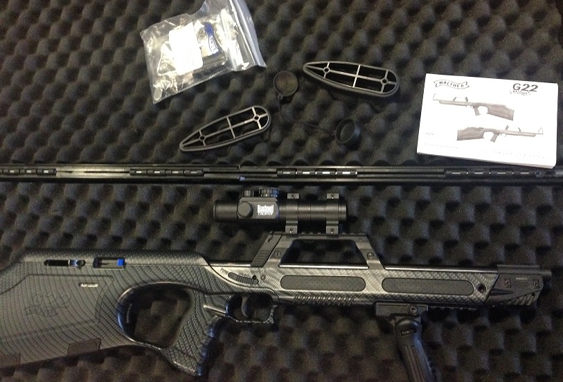 Carabina G22 Carbono, con visor punto rojo Bushnell, maletin y puntero láser original Walther