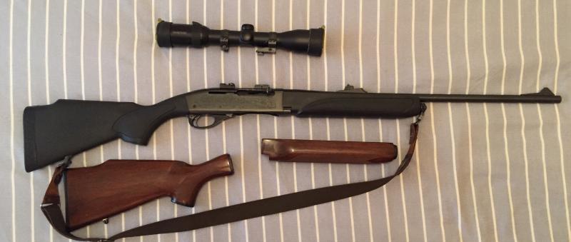 Vendo Remington 7400, del calibre 30-06 con guarda manos y culata de madera y sintéticos, anillas y monturas fijas y desmontables tipo apel, con dos cargadores, en perfecto estado por 700 €.