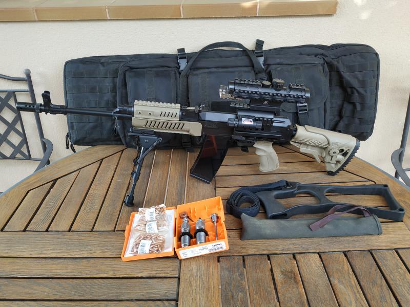 Rifle semi VZ58 cal. 222 Rem semiautomático, importado por Nidec, lleba montado una kit FAB Defence, apagallamas roscado en la punta, cargador original, visor NCstar con retícula iluminada, bípode plegable, montura y accesorios originales, dais del cal 222 Rem, 150 puntas y maletín de transporte.
