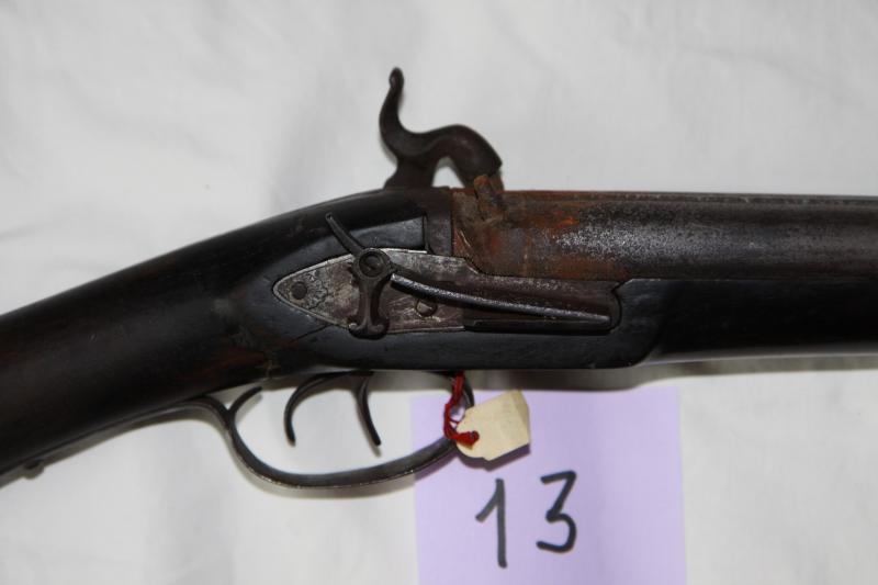 Escopeta de caza de avancarga de dos cañones. Mecanismos de pistón con muelles reales externos. Le falta un gatillo, que está averiado y se adjunta a esta arma.