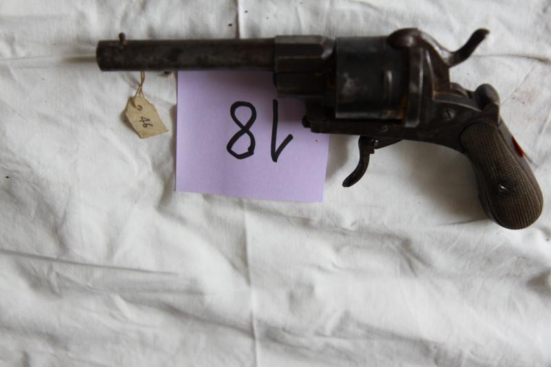 Revolver de retrocarga, de seis tiros. Fuego anular. Mecanismo tipo Lafoucheux.