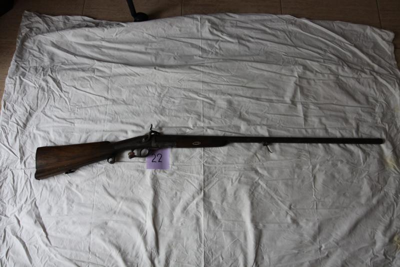 Escopeta de caza de retrocarga, de un cañón. Fuego anular. Mecanismo tipo Lafoucheux. Culata española.