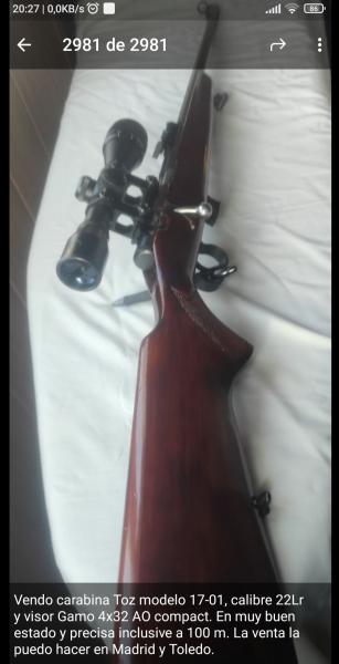 Vendo carabina Toz 17-01, calibre 22 Lr y visor Gamo 4x32 AO compact, en muy buen estado y precisa, inclusive a 100m.