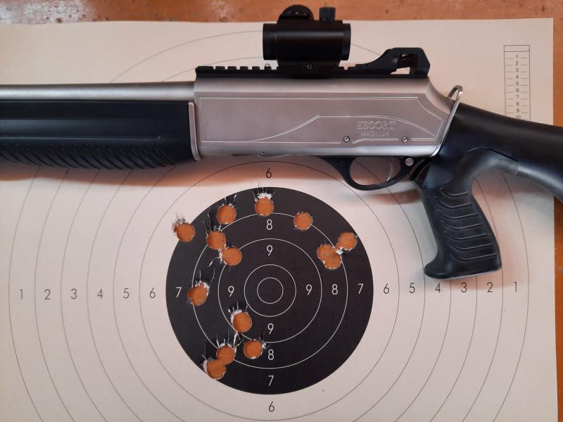 Al llevar pistolete es un arma cómoda para disparar cartuchos Magnum ya que la mano absorbe gran parte del retroceso. La vendo por pasar a categoría superior. Está prácticamente nueva. Ha participado en una suelta de faisanes y en dos competiciones de IPSC. Es un arma cómoda, ágil y sorprendentemente precisa. La diana donde hay 15 tiros aunque solo se cuentan 14 ya que uno está doblado, está hecha a una distancia de 45 metros y con munición muy sencilla que no llega a euro la bala. Solo se ha tirado con bala para centrar el visor de punto rojo que se entrega con la escopeta. Para IPSC se utilizan cartuchos de plato.
