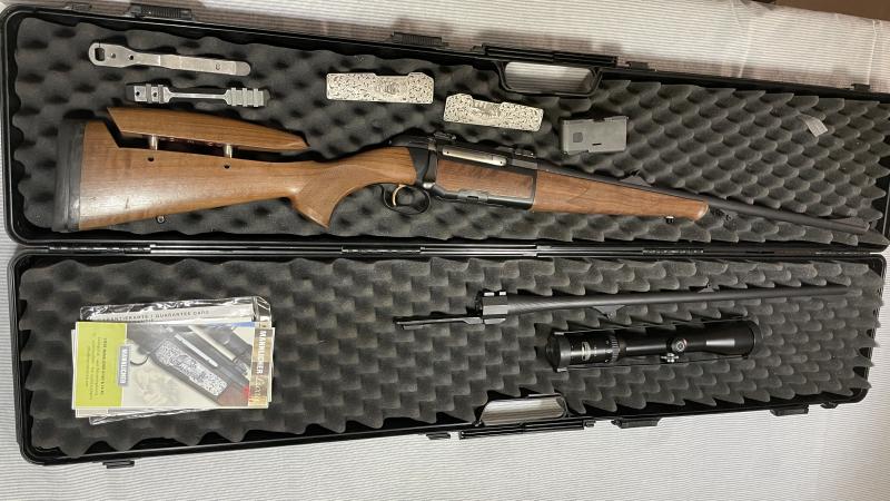Rifle mannlicher luxus 243w + cañón 270w. gatillo al pelo. bases apel en los 2 cañones. 2 cargadores. carrillera ajustable en altura e inclinación. pletinas grabadas motivos caza o de madera. intercambiables. maletín rígido. visor monterua schmidt&bender 1.5-6x42 con monturas apel. Precio del conjunto 2.100€