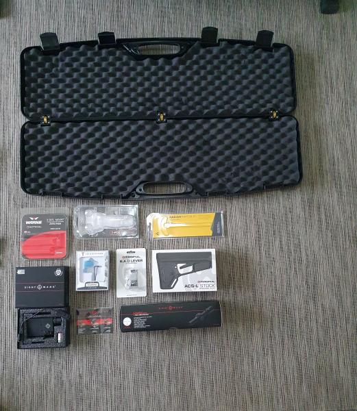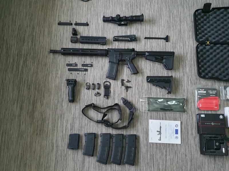 A esto añadir: correa Magpul 2/3 posiciones y conectores varios 2 sistemas. Carriles picatinny para el sistema Key-Mod Guardamanos original y para Guardamanos Tony System. Cargador original y 5 cargadores Magpul. Grip mano bipode FAB Defense.