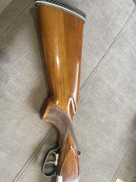 Vendo escopeta superpuesta Laurona cal. 12, en el lateral del cañón, debajo de la caña indica ** y **** y 71 cm., expulsores, cromo negro.