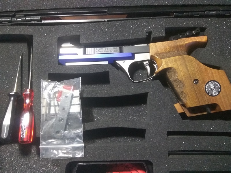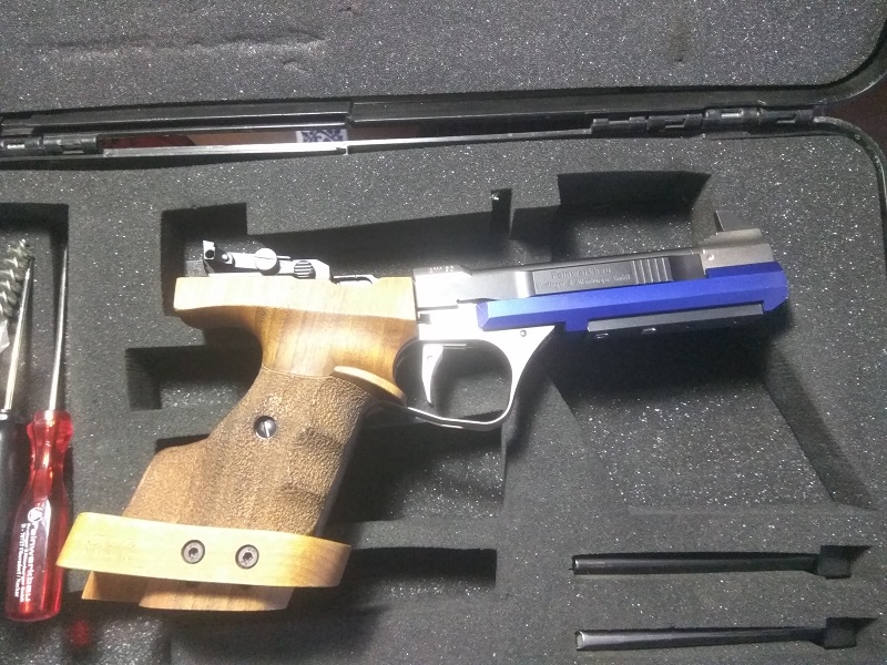 Pongo a la venta pistola Feinwerkbau AW93 .22 LR en perfecto estado, como nueva. Dos contrapesos, llaves, manual de instrucciones y desarme, maletín original, cachas anatómicas diestro talla M, baquetas de limpieza, dos cargadores. La he usado en dos tiradas Autonómicas, no mas de 200 disparos. No golpes ni ralladuras.