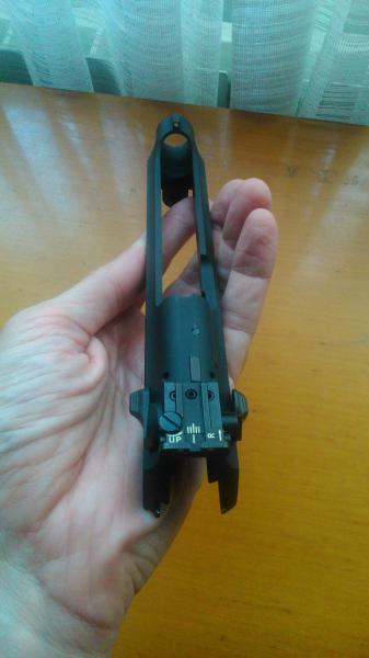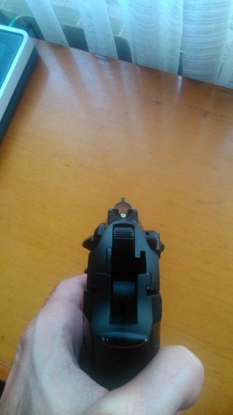 Es el modelo sin curvatura en la empuñadura y con miras en u. Guía retroceso metálica.
