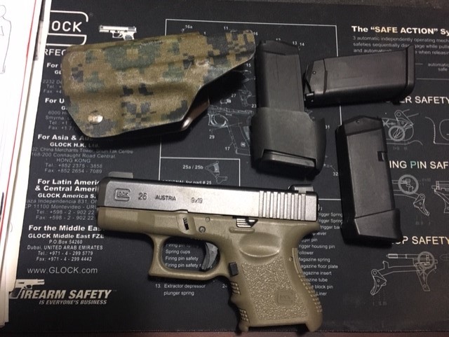 Vendo Glock 26, 3ge, funda diestra, un cargador de 17, un cargador de 12 y uno de 10 cartuchos, 450 €.