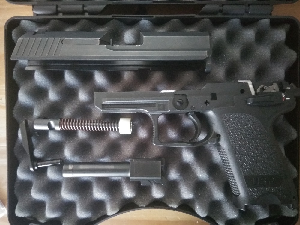 Esta en perfecto estado de funcionamiento; las letras blancas se las hice con Tipe, por lo que se le puede quitar cuando se quiera; los cargadores perfectos; marcas normales de llevarla en la funda oculta de paisano; guiada en A; poquísimos disparos, no mas de 200; libro de instrucciones; maletín original HK; la puedo adaptar para zurdo, tengo la palanca, así como ambidiestra