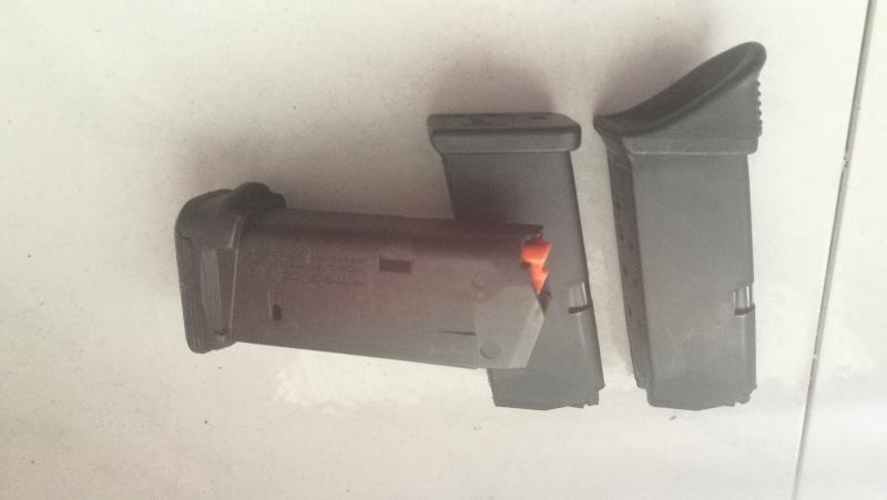 3 cargadores, un magpul ampliado(tapon naranja 22€), cargador glock con suplemento para dedo meñique, cargador normal glock.