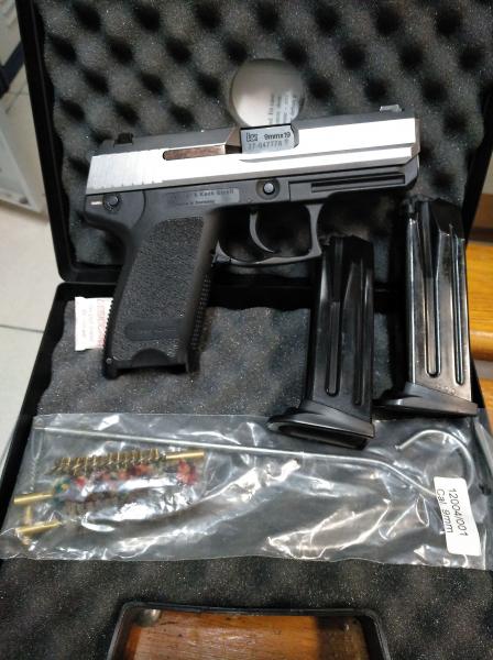 Pistola 9mm. HK USP Compact. Inox- negro. Kit de limpiez. Funda de seguridad rígida Safari Land. Perfecto estado. Dos cargadores. Caja original.