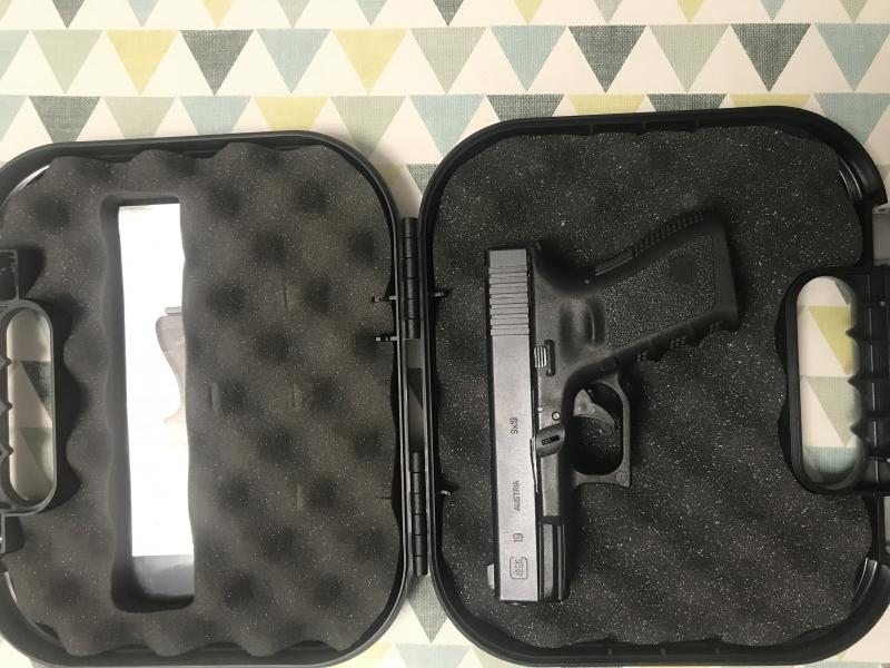 Hola, por cambio de arma a compactas quiero vender 2 Glock 19 en un estado excepcional con apenas 4-5 tiradas cortas, maletín, dos cargadores y accesorios originales sin usar. Regalo puntero láser de empuñadura Trasom Crace. Precio algo negociable.
