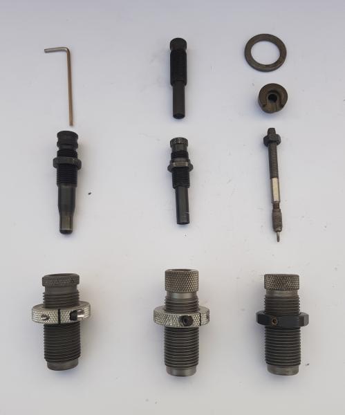 Se incluye, como es lógico, el shell holder y la llave allen para apretar/aflojar las roscas de los dies y de regalo unas 250 vainas de un tiro, limpias, desempistonadas y recalibradas.