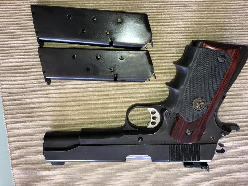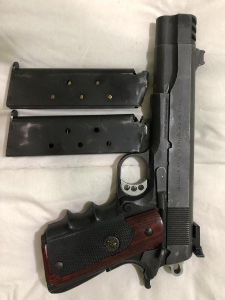 Vendo pistola Norinco 1911, calibre .45 ACP, cañon con ánima como espejo, gatillo y martillo aligerados, empavonado azul oscuro, cachas anatómicas antideslizantes, miras de fibra optica, alza regulable en altura y deriva, compensador de fuego con guia y reten de resorte para dicho compensador, kit conversor en calibre . 22 LR, norteamericano,100 vainas Starline, norteamericanas en su estuche, cuadro dies de recarga y galga, funda táctica IMI ( Industria Militar Israeli) dos cargadores también con pavón azulado