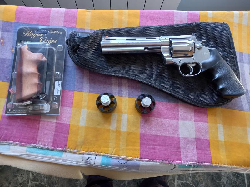 Hola foreros, se vende Colt Anaconda, con funda, 2 cargadores rapidos y unas cachas de madera intercambiables. El arma está en la provincia de Cuenca. Precio 700€. Envio fotos.