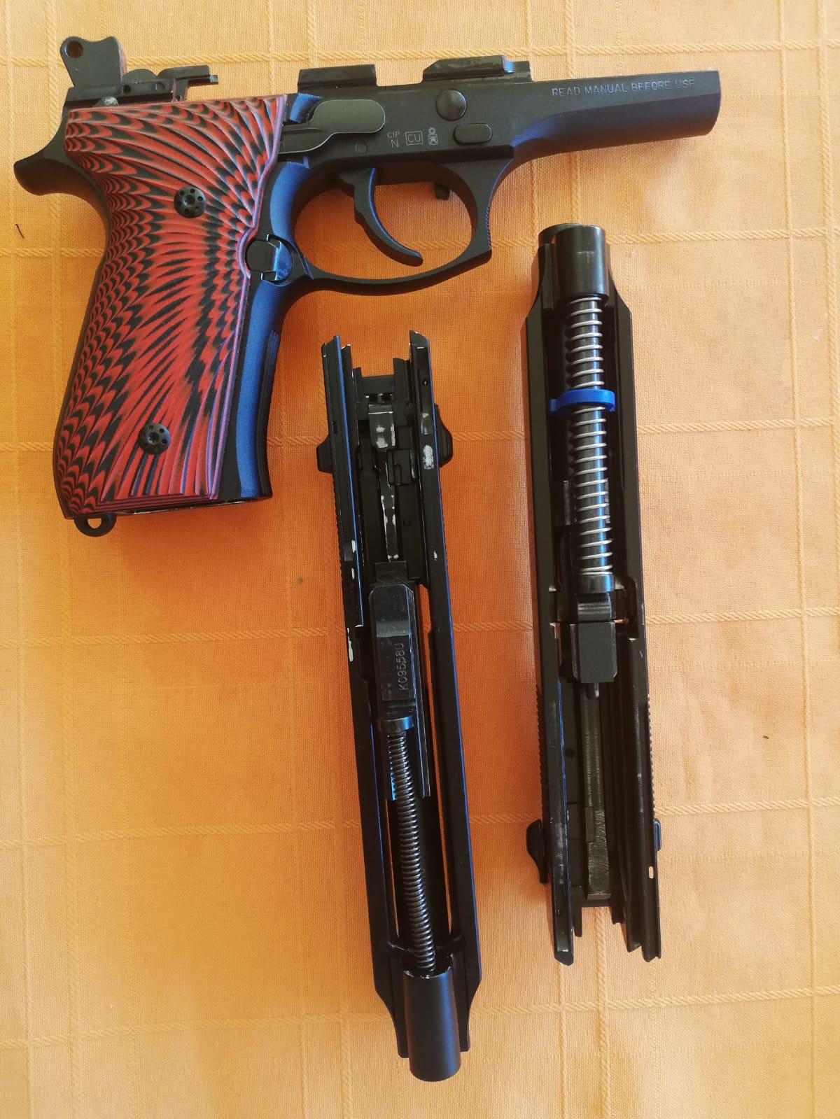 Se incluyen sus cajas originales, dos cargadores del 9 Parabellum y 2 cargadores del 22lr, las herramientas de mantenimientos que venían de fábrica y varios accesorios (muelles diferentes fuerzas para la corredera, gatillo ajustable y alguna cosa más todos sin estrenar tan siquiera). Le puse alza micrométrica, expulsor cargador sobredimensionado y la guía y el muelle de la corredera de acero, también cambié las cachas para darle un poco de color, se adjuntas las piezas originales.