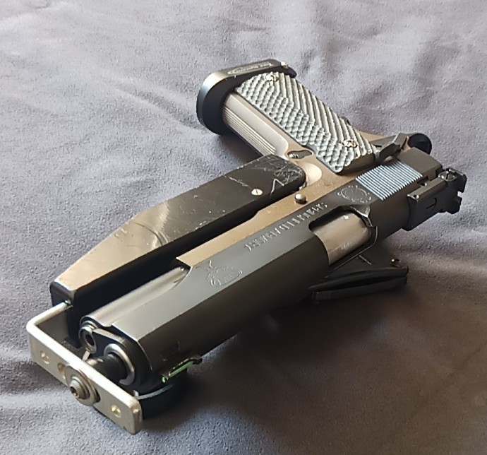Pistola Springfield Gold Match, pistola utilizada para IPSC, en perfecto estado de uso, pintada en Ceracote Negro y Verde Bronce, Funnel de Tony Sistems, con todas las piezas de competición ajustadas (Disparador, Aleta Sobredimensionada, Reten de Cargador Sobredimensionado etc...). Se entrega con cuatro cargadores y Funda.