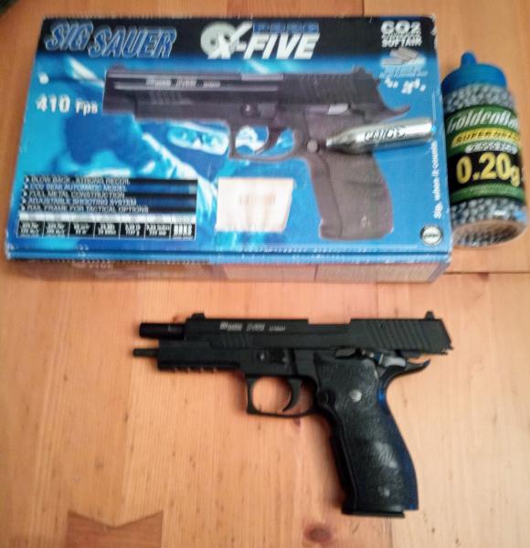Vendo pistola semiautomática de CO2, marca Sig Sauer P 226 X-FIVE, toda de metal, lanza bolas de 6 mm, velocidad de salida 125 m/s, peso 1136 gr. regalo bote de 2000 bolas y 3 cargas de CO2. precio 110€ , esta en Madrid
