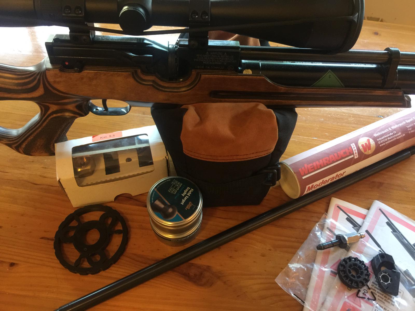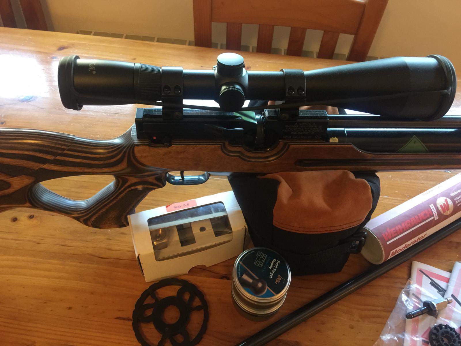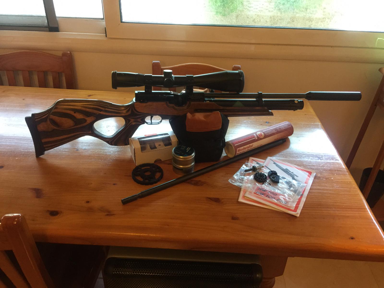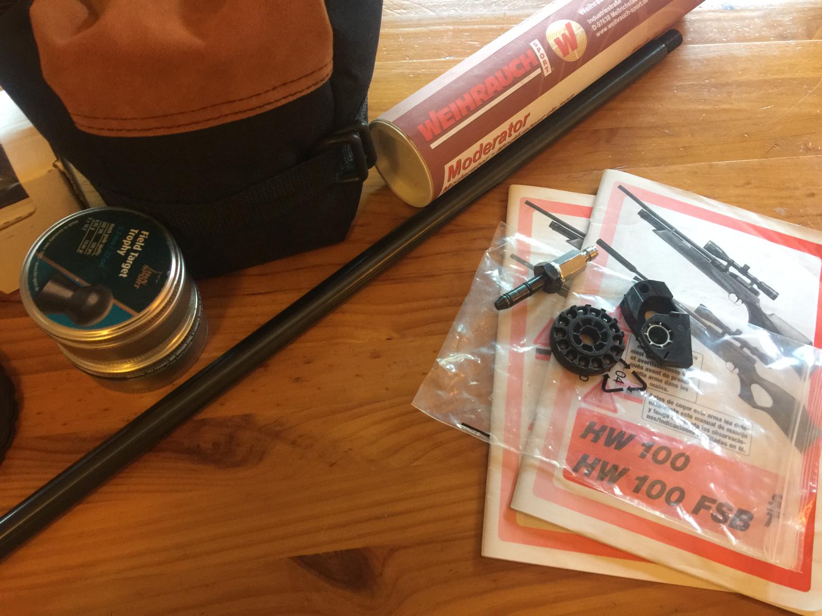 Carabina hw100 en perfecto estado, dos cañones uno corto y otro largo, silenciador weihrauch,visor Bsa 32 aumentos, cargador 10 tiros más uno monotiro,valvula de llenado rápido,todos los accesorios 600€