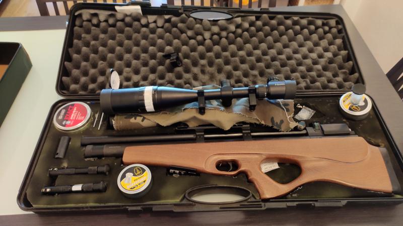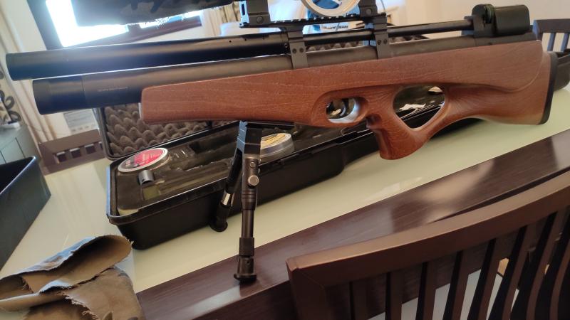 Con mejora , se le ha hecho un (Air stripper) en el enfundado del cañón cómo a la Onix M16a para que no salte el cual la mejoro mucho. Con mira telescópica 8-32x50 con paralaje frontal , con parasol, con tapas , con monturas, con bípode , con maleta. PRECIO:450€