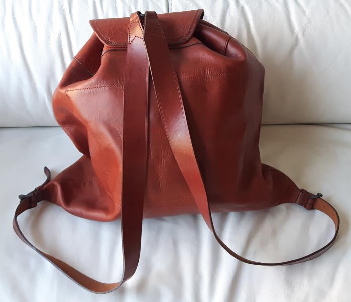 Piel natural curtida al vegetal. Hecho a mano por guarnicionero hace un año. Me costó 185 euros. Apenas usado. Esta pensado para caza pero yo lo usé solo por ciudad. Tamaño grande, 45cm de alto por 48cm de ancho. Bolsillo interior. Se cierra con cordón de piel además de tapa viveada en piel.